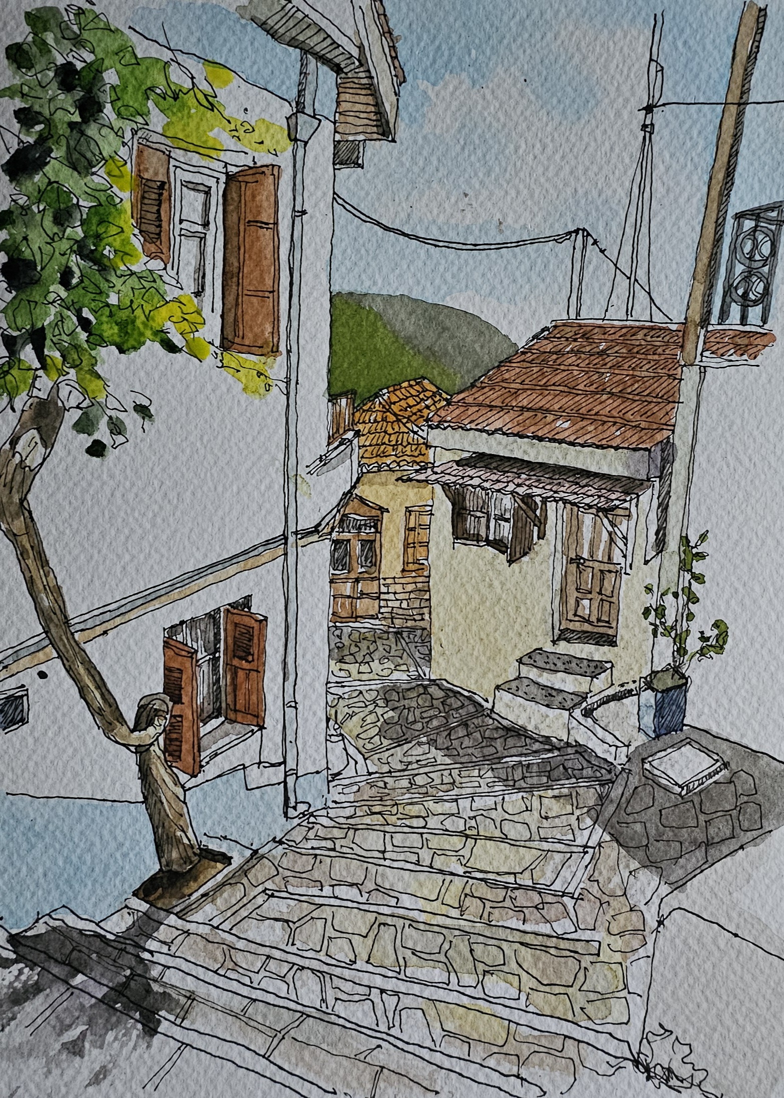 흥해 수업때 그린 유럽 내리막 골목길 풍경입니다.